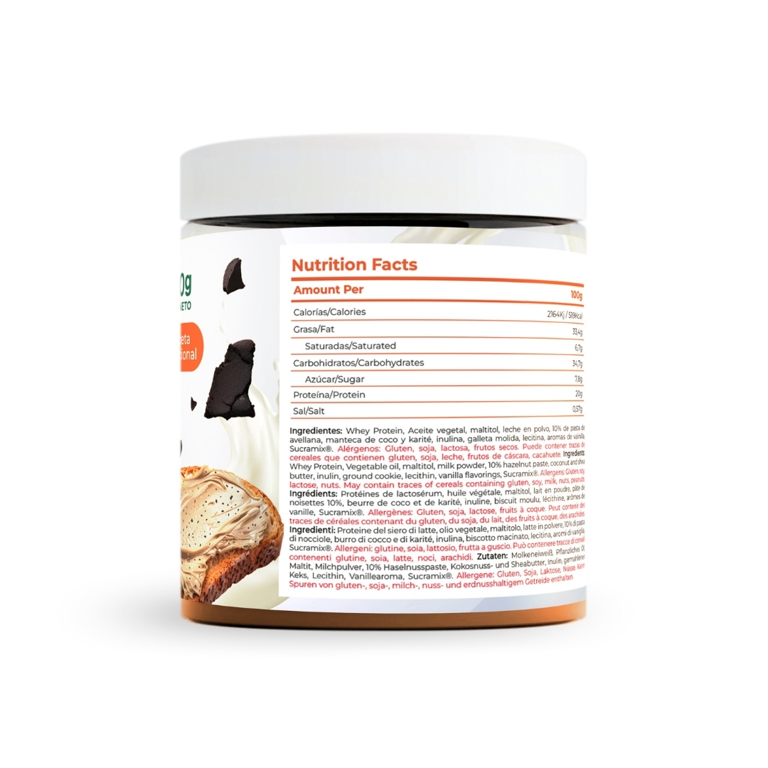 La crema de chocolate blanco con avellanas tostadas y trocitos de galleta negra que revolucionará tu forma de disfrutar los dulces. Diseñada para quienes buscan una alimentación equilibrada sin renunciar al sabor, esta crema contiene un 20% de proteínas, es baja en azúcar, no contiene aceite de palma y tiene una textura irresistible. Perfecta para untar, añadir a tus postres favoritos o disfrutar directamente a cucharadas.